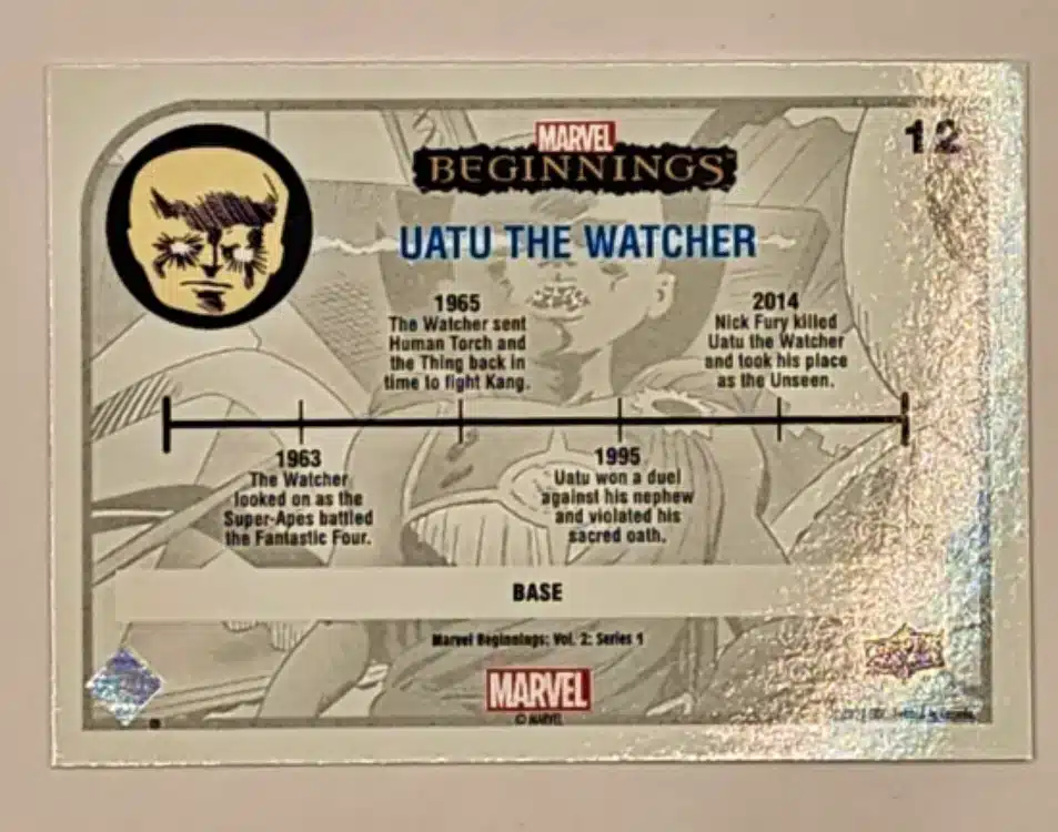 This Uatu The Watcher Marvel Beginnings Upper Deck 2022 Marvel Beginnings is card #12. This collection boasts a diverse array of characters from the Marvel Universe. With a history spanning over 80 years, it has given birth to some of the most iconic and beloved characters, including Spider-Man, the X-Men, the Avengers, and the Guardians of the Galaxy. Each character, with its unique story and powers, has captured the hearts and imaginations of millions of fans worldwide, promising an exciting and intriguing collection. With 180 cards in the base set, there’s plenty of content to explore, ensuring that every fan feels valued and catered to.